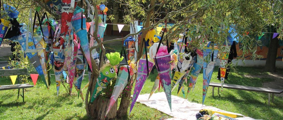 Einschulung – Schule (scuola) preceduta dal prefisso ein- che indica dentro o il movimento di entrata. Questa parola descrive l’inizio della carriera scolastica, il primissimo giorno di scuola. Tra l’altro è un termine carico di significati poiché in questa giornata si svolge una vera e propria festa a scuola. I genitori si prendono un giorno di ferie, partecipano anche i nonni, i fratelli e le sorelle, e ci si ritrova tutti nella palestra o nell’aula magna della scuola. Ogni istituto ha le sue tradizioni fra discorsi di benvenuto, canzoni del coro o dell’orchestra scolastica, rappresentazioni teatrali e altro. Finché i bambini e le bambine vengono chiamati a uno a uno dalle maestre e dai maestri e portati in classe per la prima, simbolica ora di lezione.